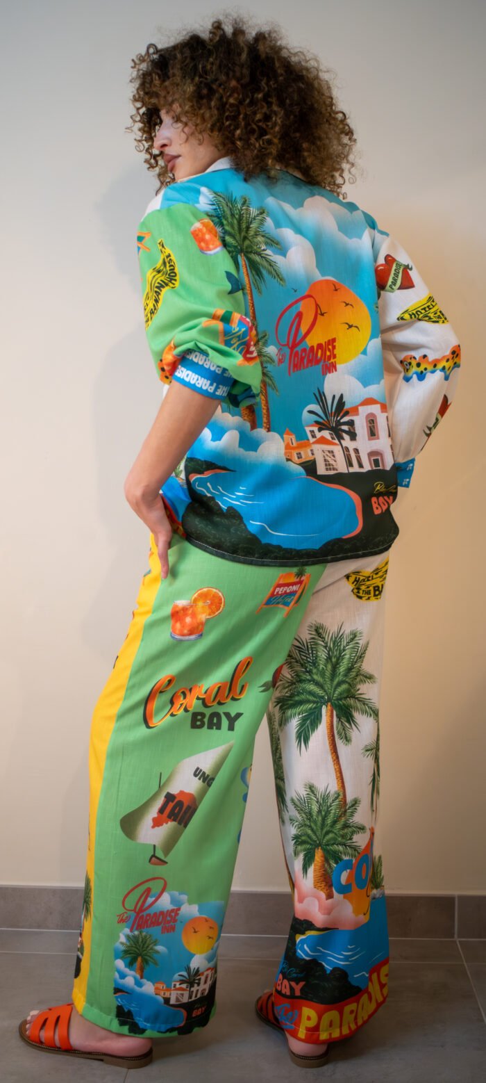 • Motifs exotiques : L’ensemble arbore des imprimés lumineux et colorés inspirés du thème « Miami », avec des palmiers, des cocktails, des slogans festifs et des illustrations de paysages paradisiaques. Chaque détail ajoute une touche de fun et de sophistication.